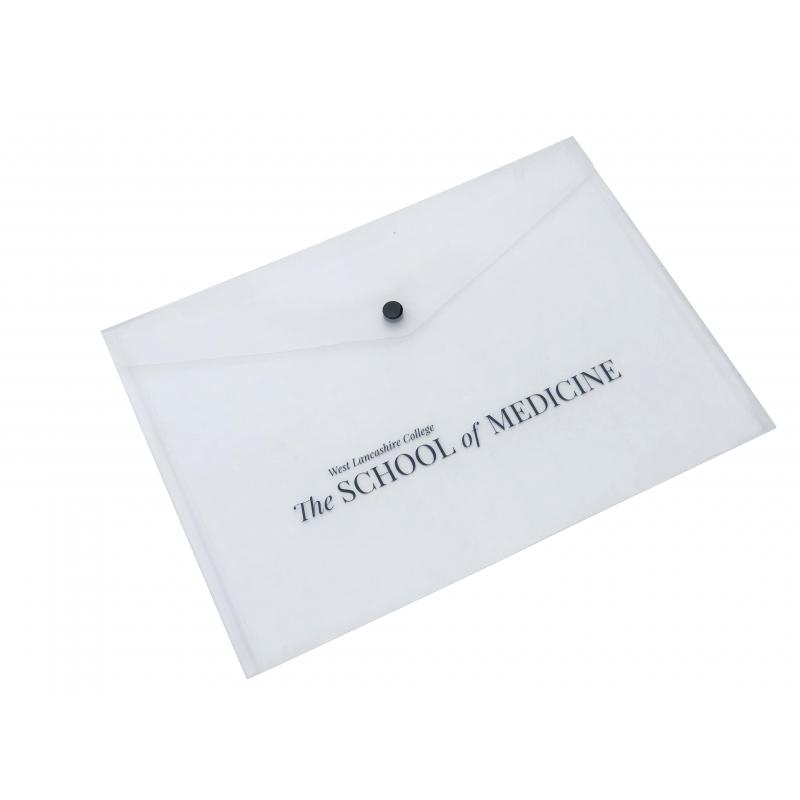 Clear polypropylene wallet with flap and plastic popper for closure.