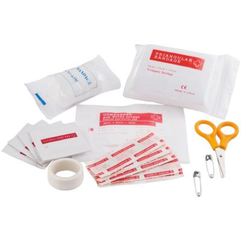 Ideal first aid kit for every active person. This kit prepares you for small injuries and accidents. Content: 12 wash proof plasters, 4 skin cleansing swabs, 2 dry swabs, 2 ice gel, 2 blister plasters, 1 elastic sport bandage. All of the first aid and care products within the kit meet all applicable EU regulations. Price includes full colour print.