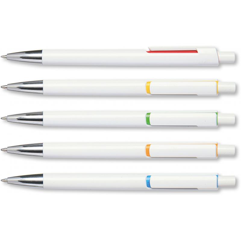 Push Button Plastic Ballpen, With A Solid White Barrel, Silver Coloured Nose Cone And A Choice Of Coloured Trims Black Ink Refills