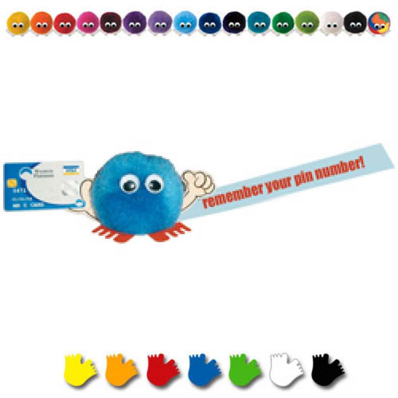 Logobug holding a credit card printed with your details Ribbon attachment printed with your promotional message in full colour Large range of 44 pom pom colours and 7 different feet colours to choose from