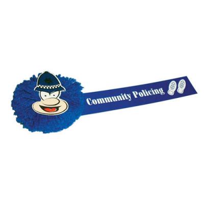 Mophead pom with card face and police helmet attached Ribbon attached with your promotional message printed in full colour