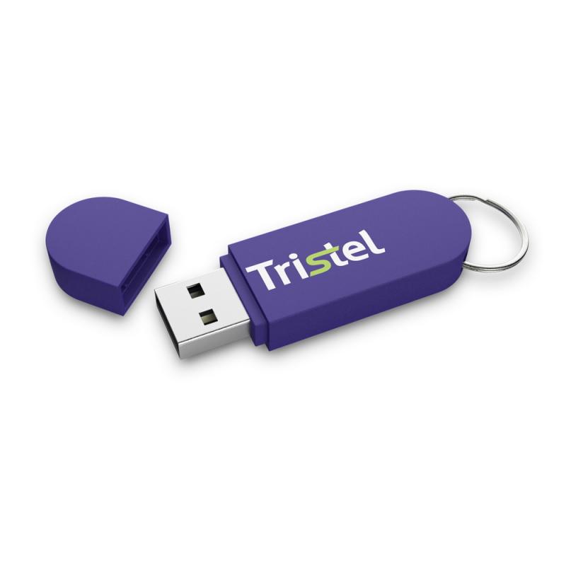 Made from a soft touch plastic with the feel of rubber plus a contrasting metal trim, this smooth, rounded USB comes in a choice of 4 colours. Suitable for branding via spot colour printing, its sturdy top easily pulls off to access the USB connector and theres a handy keyring clip at the other end.